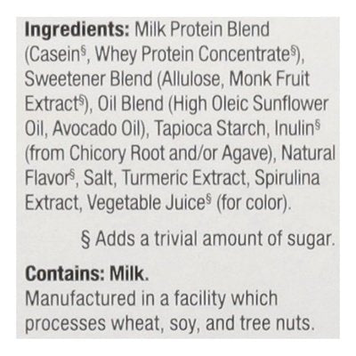 INGREDIENTS: Milk Protein Blend (Casein, Whey Protein Concentrate), Sweetener Blend (Allulose, Monk Fruit Extract), Oil Blend (High Oleic Sunflower Oil, Avocado Oil), Tapioca Starch, Inulin (from Chicory Root and/or Agave), Natural Flavor, Salt, Turmeric Extract, Spirulina Extract, Vegetable Juice (Adds a Trivial Amount of Sugar) (for Color).