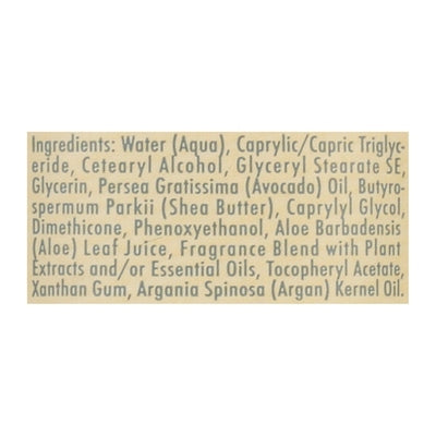 INGREDIENTS: Water (Aqua), Caprylic/Capric Triglyceride, Cetearyl Afcohol, Glyceryl Stearate SE, Glycerin, Persea Gratissima (Avocado) Oil, Butyrospermum Parkii (Shea Butter), Caprylyl Glycol, Dimethicone, Phenoxyethanol, Aloe Barbadensis (Aloe) Leaf Juice, Fragrance Blend with Plant Extracts and/or Essential Oils, Tocopheryl Acetote, Xanthan Gum, Argania Spinosa (Argan) Kernel Oil.