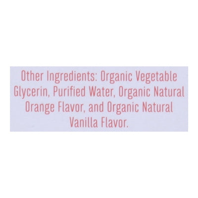 INGREDIENTS: Other Ingredients: Organic Vegetable Glycerin, Purified Water, Organic Natural Orange Flavor, and Organic Natural Vanilla Flavor.
