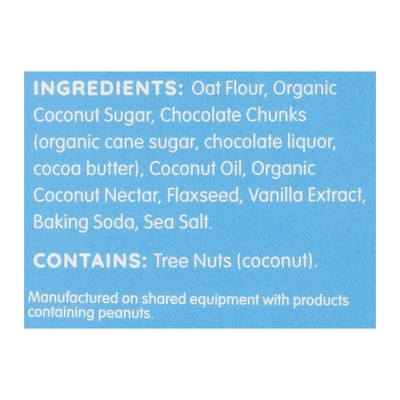INGREDIENTS: Oat Flour, Organic Coconut Sugar, Chocolate Chunks (Organic Cane Sugar, Chocolate Liquor, Cocoa Butter), Coconut Oil, Organic Coconut Nectar, Flaxseed, Vanilla Extract Baking Soda, Sea Salt.