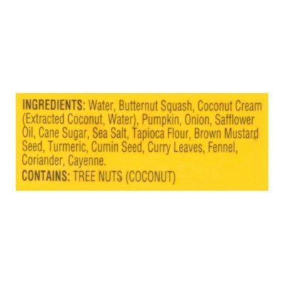 INGREDIENTS: Water, Butternut Squash, Coconut Cream (Extracted Coconut, Water), Pumpkin, Onion, Safflower Oil, Cane Sugar, Sea Salt, Tapioca Flour, Brown Mustard Seed, Turmeric, Cumin Seed, Curry Leaves, Fennel, Coriander, Cayenne.