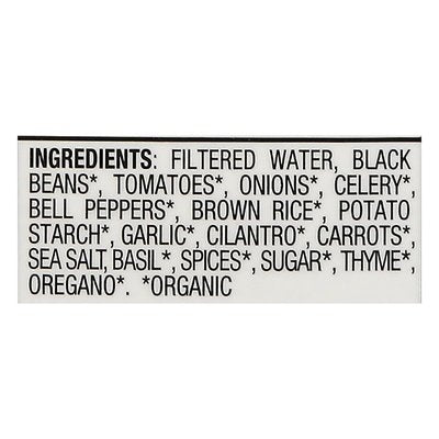 INGREDIENTS: Filtered Water, Black Beans (Organic), Tomatoes (Organic), Onions (Organic), Celery (Organic), Bell Peppers (Organic), Brown Rice (Organic), Potato Starch (Organic), Garlic (Organic), Cilantro (Organic), Carrots (Organic), Sea Salt, Basil (Organic), Spices (Organic), Sugar (Organic), Thyme (Organic), Oregano (Organic).