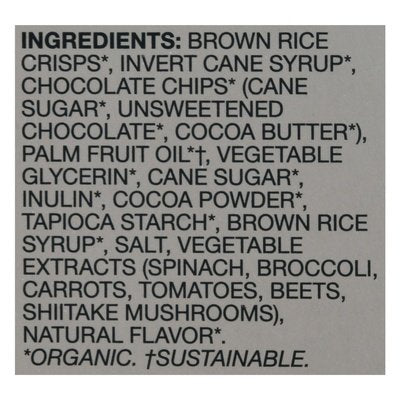 INGREDIENTS: Brown Rice Crisps (Organic), Invert Cane Syrup (Organic), Brown Rice Syrup (Organic), Chocolate Chips (Organic) (Cane Sugar (Organic), Unsweetened Chocolate (Organic), Cocoa Butter (Organic)), Vegetable Glycerin (Organic), Water, Cocoa Powder (Organic), Palm Fruit Oil (Organic) (Sustainable), Inulin (Organic), Pea Protein Isolate (Organic), Salt, Natural Flavor (Organic), Tapioca Starch (Organic), Vegetable Extracts (Spinach, Broccoli, Carrots, Tomatoes, Beets, Shiitake Mushrooms), Xanthan Gum.
