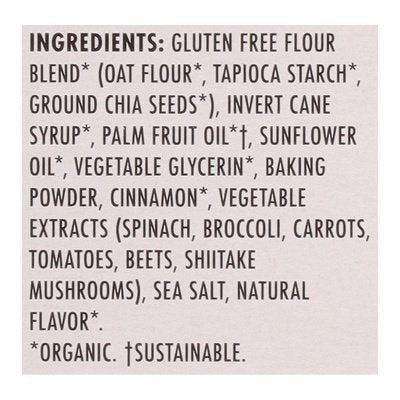 DESCRIPTION: Soft baked mini cookies. No artificial colors or flavors. USDA Organic. Certified Organic by Pro-Cert. Nut free. Certified Gluten free by gfco.org. Certified vegan. vegan.org. Made in a dedicated peanut and tree nut free facility. Allergy Friendly: Dedicated Facility Free from the Following Common Allergens: Peanut; soy; sesame; tree nut; dairy; fish & shellfish. Contains nutrients from vegetable extracts. Good source of vitamin C & D. Non-GMO Project verified. nongmoproject.org. Nutrients from vegetables. What make this product Madegood. www.madegoodfoods.com. Facebook. Instagram. Connect with us (at)madegoodfoods. Do you want to learn more about Made Good? Visit us on: www.madegoodfoods.com. Certified B Corporation. Recyclable. FSC: Mix - Paper from responsible sources. www.fsc.org. Product of Canada. < Gluten Free Flour Blend (Organic) (Oat Flour (Organic), Tapioca Starch (Organic), Ground Chia Seeds [Organic]), Invert Cane Syrup (Organic), Vegetable Oils (Organic) (Palm Fruit Oil [Organic] [Sustainable], Sunflower Oil [Organic]), Vegetable Glycerin (Organic), Baking Powder, Cinnamon (Organic), Vegetable Extracts (Spinach, Broccoli, Carrots, Tomatoes, Beets, Shiitake Mushrooms), Sea Salt, Natural Flavor (Organic).