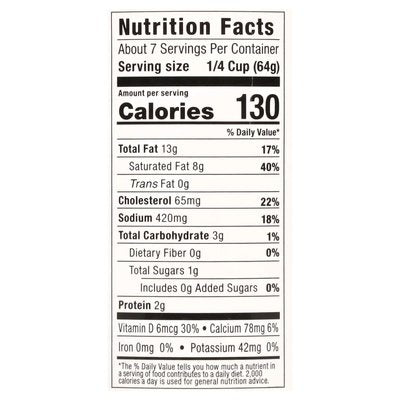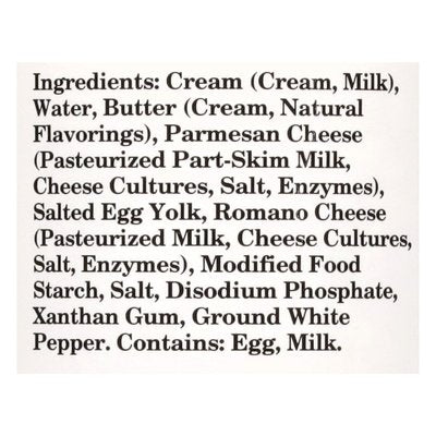 INGREDIENTS: Cream (Cream, Milk), Water, Butter (Cream, Natural Flavorings), Parmesan Cheese (Pasteurized Part-Skim Milk, Cheese Cultures, Salt, Enzymes), Salted Egg Yolk, Romano Cheese (Pasteurized Milk, Cheese Cultures Salt, Enzymes), Modified Food Starch, Salt, Disodium Phosphate, Xanthan Gum, Ground White Pepper.