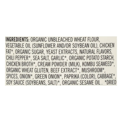 INGREDIENTS: Organic Unbleached Wheat Flour, Vegetable Oil (Sunflower and/or Soybean Oil), Chicken Fat (Dried), Organic Sugar, Yeast Extracts, Natural Flavors, Chili Pepper (Dried), Sea Salt, Garlic (Dried), Organic Potato Starch, Chicken Broth (Dried), Cream Powder (Milk), Kombu Seaweed (Dried), Organic Wheat Gluten, Beef Extract (Dried), Mushroom (Dried), Spices, Onion (Dried), Green Onion (Dried), Paprika (Color), Cabbage (Dried), Soy Sauce (Soybeans, Salt) (Dried), Organic Sesame Oil.