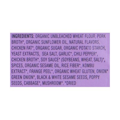 INGREDIENTS: Organic Unbleached Wheat Flour, Miso (Dried) (Soybeans, Cultured Rice [Rice, Aspergillus Oryzae], Salt), Organic Sunflower Oil, Sea Salt, Chicken Fat (Dried), Natural Flavors, Chicken Broth (Dried), Yeast Extracts, Organic Wheat Gluten, Kombu Extract (Dried), Fermented Soybean Sauce (Dried) (Soybeans, Wheat, Salt), Wakame Seaweed (Dried), Mushroom(Dried), Chicken, Organic Sesame Oil, Cabbage (Dried).