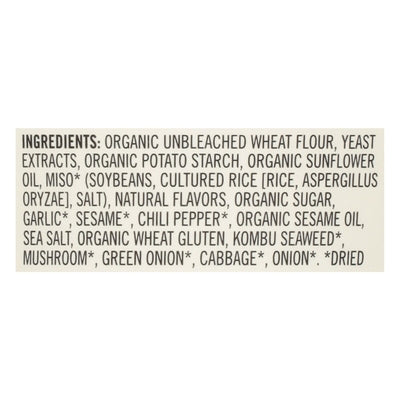 INGREDIENTS: Organic Unbleached Wheat Flour, Yeast Extract, Organic Potato Starch, Organic Sunflower Oil, Miso (Dried) (Soybeans, Cultured Rice [Rice, Aspergillus Oryzae], Salt), Natural Flavors, Organic Sugar, Garlic (Dried), Sesame (Dried), Chili Pepper (Dried), Organic Sesame Oil, Sea Salt, Organic Wheat Gluten, Kombu Seaweed (Dried), Mushroom (Dried), Green Onion (Dried), Cabbage (Dried), Onion (Dried).