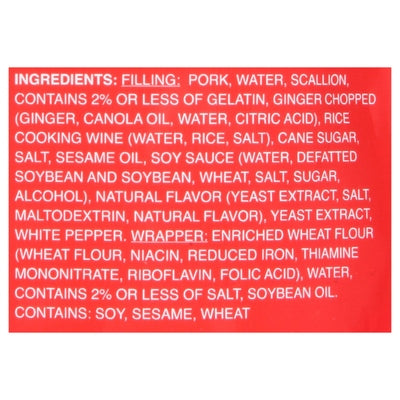 INGREDIENTS: Filling: Pork, Water, Scallion, Contains 2% or Less of Gelatin, Ginger Chopped (Ginger, Canola Oil, Water, Citric Acid), Rice Cooking Wine (Water, Rice, Salt), Cane Sugar, Salt, Sesame Oil, Soy Sauce (Water, Defatted Soybean and Soybean, Wheat, Salt, Sugar, Alcohol), Natural Flavor (Yeast Extract, Salt, Maltodextrin, Natural Flavor), Yeast Extract, White Pepper, Wrapper: Enriched Wheat Flour (Wheat Flour, Niacin, Reduced Iron, Thiamine Mononitrate, Riboflavin, Folic Acid), Water, Contains 2% or Less of Salt, Soybean Oil.