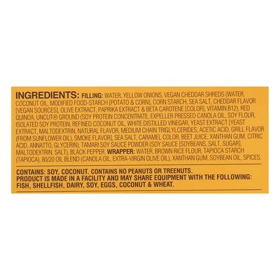 INGREDIENTS: Filling: Water, Yellow Onions, Vegan Cheddar Shreds (Water, Coconut Oil, Modified Food-Starch [Potato & Corn], Corn Starch, Sea Salt, Cheddar Flavor [Vegan Sources], Olive Extract, Paprika Extract & Beta Carotene [Color], Vitamin B12), Red Quinoa, Uncut Ground (Soy Protein Concentrate, Expeller Pressed Canola Oil, Soy Flour, Isolated Soy Protein, Refined Coconut Oil, White Distilled Vinegar, Yeast Extract [Yeast Extract, Maltodextrin, Natural Flavor, Medium Chain Triglycerides, Acetic Acid, Grill Flavor (from Sunflower Oil), Smoke Flavor], Sea Salt, Caramel Color, Beet Juice, Xanthan Gum, Citric Acid, Annatto, Glycerin), Tamari Soy Sauce Powder (Soy Sauce [Soybeans, Salt, Sugar], Maltodextrin, Salt), Black Pepper, Wrapper: Water, Brown Rice Flour, Tapioca Starch (Tapioca), 80/20 Oil Blend (Canola Oil, Extra-Virgin Olive Oil), Xanthan Gum, Soybean Oil, Spices.