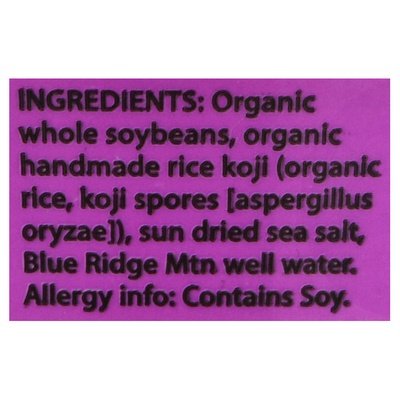 INGREDIENTS: Organic Whole Soybeans, Organic Handmade Rice Koji (Organic Rice, Koji Spores [Aspergillus Oryzae]), Sun Dried Sea Salt, Blue Ridge Mtn Well Water.