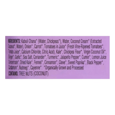INGREDIENTS: Kabuli Chana (Organically Grown and Processed) (Water, Chickpeas (Organically Grown and Processed)), Water, Coconut Cream (Organically Grown and Processed) (Extracted Coconut (Organically Grown and Processed), Water), Onion (Organically Grown and Processed), Carrot (Organically Grown and Processed), Tomatoes in Juice (Organically Grown and Processed) (Fresh Vine-Ripened Tomatoes (Organically Grown and Processed), Tomato Juice (Organically Grown and Processed), Calcium Chloride, Citric Acid), Kale (Organically Grown and Processed), Chickpea Flour (Organically Grown and Processed), Virgin Coconut Oil (Organically Grown and Processed), Ginger (Organically Grown and Processed), Garlic (Organically Grown and Processed), Sea Salt, Coriander (Organically Grown and Processed), Turmeric (Organically Grown and Processed), Jalapeno Pepper (Organically Grown and Processed), Cumin (Organically Grown and Processed), Lemon Juice Concentrate (Organically Grown and Processed), Dried Kale (Organically Grown and Processed), Fennel (Organically Grown and Processed), Cinnamon (Organically Grown and Processed), Clove (Organically Grown and Processed), Sweet Paprika (Organically Grown and Processed), Black Pepper (Organically Grown and Processed), Cardamom (Organically Grown and Processed), Nutmeg (Organically Grown and Processed), Cayenne (Organically Grown and Processed).