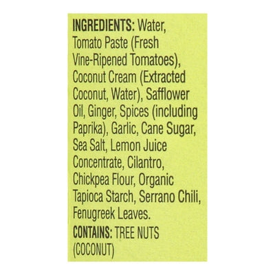 DESCRIPTION: Toasty spices & tangy tomato. Vegan. Gluten free. Non GMO Project verified. nongmoproject.org. Decadently rich but without the dairy, our Vegan Tikka Masala will delight you with its tangy tomato and creamy texture. Toasted cumin and bittersweet fenugreek add rich roasted aromas. We take our time preparing this sauce to give you the fullest, most exceptional flavors. I bring a fresh perspective to may delicious heritage, inviting you to experience the beautiful complexity of Indian food and share it with the people you love. - Maya Kaimal. Award-winning cookbook author. mayakaimal.com. Instagram. Facebook. Twitter. Visit mayakaimal.com for more delicious products. Please recycle. < Water, Tomato Paste (Fresh Vine-Ripened Tomatoes), Coconut Cream (Extracted Coconut, Water), Safflower Oil, Ginger, Spices (Including Paprika), Garlic, Cane Sugar, Sea Salt, Lemon Juice Concentrate, Cilantro, Chickpea Flour, Organic Tapioca Starch, Serrano Chili, Fenugreek Leaves.