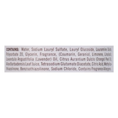INGREDIENTS: Contains: Water, Sodium Lauryl Sulfate, Lauryl Glucoside, Lauramine Oxide Polysorbate 20, Glycerin, Fragrance, (Coumarin, Geraniol, Limonene, Linalool Lavandula Angustifolia (Lavender) Oil, Citrus Aurantium Dulcis (Orange) Peel Oil, Aloe Barbadensis Leaf Juice, Tetrasodium Glutamate Diacetate, Citric Acid, Methylis Thiazolinone, Benzisothiazolinone, Sodium Chloride.