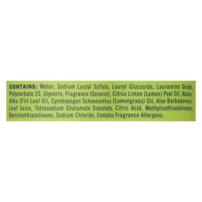 INGREDIENTS: Contains: Water, Sodium Lauryl Sulfate, Lauryl Glucoside, Lauramine Oxide, Polysorbate 20, Glycerin, Fragrance, (Geraniol), Citrus Limon (Lemon) Peel Oil, Aloe Alba (Fir) Leaf Oil, Cymbopogon Schoenanthus (Lemongrass) Oil, Aloe Barbadensis Leaf Juice, Tetrasodium Glutamate Diacetate, Citric Acid, Methylisothiazolinone, Benzisothiazolinone, Sodium Chloride.
