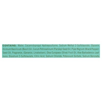 INGREDIENTS: Contains: Water, Cocamidopropyl Hydroxysultaine, Sodium Methyl 2-Sulfolaurate, Glycerin, Ocimum Basilicum (Basil) Oil, Carum Petroselinum (Parsley) Seed Oil, Piper Nigrum (Black Pepper) Seed Oil, Fragrance, (Geraniol, Linaloolsen), Olea Europaea (Olive) Fruit Oil, Aloe Barbadensis Leaf Juice, Disodium 2-Sulfolaurate, Citric Acid, Sodium Chloride, Potassium Sorbate, Sodium Benzoate.
