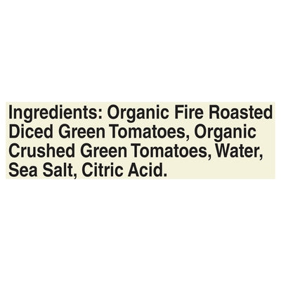 INGREDIENTS: Organic Fire Roasted Diced Green Tomatoes, Organic Crushed Green Tomatoes, Water, Sea Salt, Citric Acid.