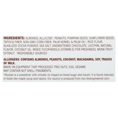 INGREDIENTS: Almonds, Allulose (Allulose is a Sweetener Found Naturally in Small Amounts in Maple Syrup, Figs and Raisins, Our Source is Produced from Non-Bioengineered Corn, Allulose Has Virtually No Impact on Blood Sugar and Insulin), Peanuts, Pumpkin Seeds, Soluble Tapioca Fiber and/or Non-GMO Corn Fiber, Sunflower Seeds, Palm Kernel Oil (Responsibly Sourced), Rice Flour, Alkalized Cocoa Powder, Sea Salt, Unsweetened Chocolate, Natural Flavor, Sunflower Lecithin, Coconut Oil, Mixed Tocopherols (Vitamin E) for Freshness, Monk Fruit Extract.