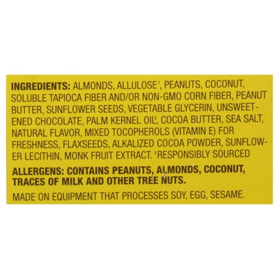 INGREDIENTS: Almonds, Allulose (Allulose is a Sweetener Found Naturally in Small Amounts in Maple Syrup, Figs and Raisins, Our Source is Produced from Non-Bioengineered Corn, Allulose Has Virtually No Impact on Blood Sugar and Insulin), Peanuts, Coconut, Soluble Tapioca Fiber and/or Non-GMO Corn Fiber, Peanut Butter, Sunflower Seeds, Vegetable Glycerin, Unsweetened Chocolate, Palm Kernel Oil (Responsibly Sourced), Cocoa Butter, Sea Salt, Natural Flavor, Mixed Tocopherols (Vitamin E) for Freshness, Flaxseeds, Alkalized Cocoa Powder, Sunflower Lecithin, Monk Fruit Extract.