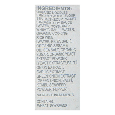 INGREDIENTS: Organic Noodles (Organic Wheat Flour, Sea Salt), Soup Packet (Organic Soy Sauce [Water, Soybeans (Organic Ingredients), Wheat (Organic Ingredients), Salt], Water, Organic Cooking Rice Wine [Water Rice (Organic Ingredients), Salt], Organic Sesame Oil, Sea Salt, Organic Sugar, Organic Yeast Extract Powder [Yeast Extract (Organic Ingredients), Salt], Onion Extract, Garlic Extract, Green Onion Extract [Green Onion, Salt], Kombu Seaweed Powder, Pepper).