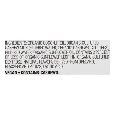 INGREDIENTS: Organic Coconut Oil, Organic Cultured Cashew Milk (Filtered Water, Organic Cashews, Cultures), Filtered Water, Organic Sunflower Oil, Contains 2 Percent or Less of: Organic Sunflower Lecithin, Organic Cultured Dextrose, Natural Flavors Derived from Oregano, Flaxseed and Plums, Lactic Acid).