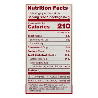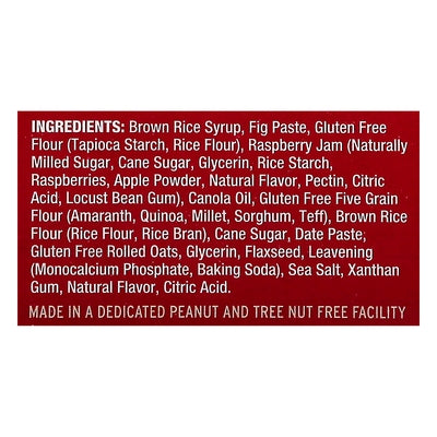 INGREDIENTS: Brown Rice Syrup, Fig Paste, Gluten Free Flour (Tapioca Starch, Rice Flour), Cane Sugar, Canola Oil, Raspberry Jam (Naturally Milled Sugar, Organic Cane Sugar, Glycerin, Organic Rice Starch, Raspberries, Apple Powder, Natural Flavor, Pectin, Citric Acid, Locust Bean Gum), Gluten Free Five Grain Flour (Amaranth, Quinoa, Millet, Sorgum, Teff), Brown Rice Flour (Rice Flour, Rice Bran), Date Paste, Gluten Free Rolled Oats, Glycerin, Flaxseed, Leavening (Monocalcium Phosphate, Baking Soda), Xanthan Gum, Sea Salt, Natural Flavor, Citric Acid.