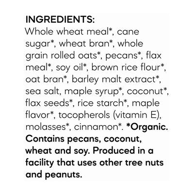 INGREDIENTS: Whole Wheat Meal (Organic), Cane Sugar (Organic), Wheat Bran (Organic), Whole Grain Rolled Oats (Organic), Pecans (Organic), Flax Meal (Organic), Soy Oil (Organic), Brown Rice Flour (Organic), Oat Bran (Organic), Barley Malt Extract (Organic), Sea Salt, Maple Syrup (Organic), Coconut (Organic), Flax Seeds (Organic), Rice Starch (Organic), Maple Flavor (Organic), Tocopherols (Vitamin E), Molasses (Organic), Cinnamon (Organic).