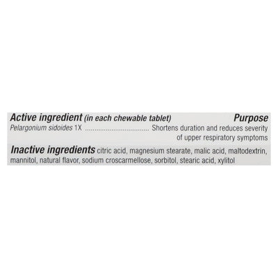 INGREDIENTS: In Each Chewable Tablet: Active Ingredients: Pelargonium Sidoides 1X, Shortens Duration and Reduces Severity of Upper Respiratory Symptoms. Inactive Ingredients: Citric Acid, Magnesium Stearate, Malic Acid, Maltodextrin, Mannitol, Natural Flavor, Sodium Croscarmellose, Sorbitol, Stearic Acid, Xylitol.