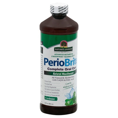 PRODUCT DETAILS: Gluten-free. Soy free/Vegetarian. No sodium-lauryl-sulfate. No artificial sweeteners. No artificial preservatives. Since 1972. Complete oral care. With natural ingredients & alcohol free. With CoQ10 & folic acid. Fluoride-free. Smile naturally! Discover Nature's Answer and trust the difference - the true nature of our standards goes way beyond the herb - PerioBrite Natural Mouthwash is a great tasting mouthwash that keeps breath fresh and clean. PerioBrite Natural Mouthwash contains phytoplenolin, a patented herbal extract that has been shown in independent laboratory studies to promote cell vitality. Soothing wildcrafted herbs, well-known for their cleansing action, are combined with CoQ10, Folic Acid, Oregano, Cinnamon and Clove to promote tooth and gum wellness. As a part of your oral health program PerioBrite Natural Mothwash energizes the whole mouth with a cool, sparkling minty-fresh sensation. www.naturesanswer.com. For product information, call (800) 439-2324. Holistically balanced. Cruelty free. Not tested in animals.