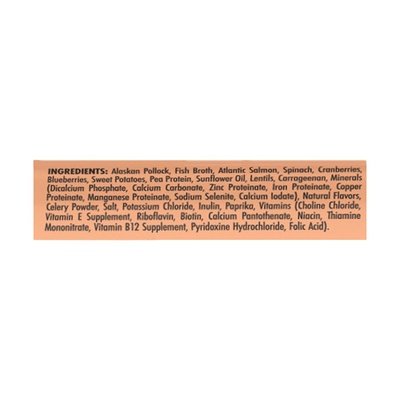 INGREDIENTS: Alaskan Pollock, Fish Broth, Atlantic Salmon, Spinach, Cranberries, Blueberries, Sweet Potatoes, Pea Protein, Sunflower Oil, Lentils, Carrageenan, Minerals (Dicalcium Phosphate, Calcium Carbonate, Zinc Proteinate, Iron Proteinate, Copper Proteinate, Manganese Proteinate, Sodium Selenite, Calcium Iodate), Natural Flavors, Celery Powder, Salt, Potassium Chloride, Inulin, Paprika, Vitamins (Choline Chloride, Vitamin E Supplement, Riboflavin, Biotin, Calcium Pantothenate, Niacin, Thiamine Mononitrate, Vitamin B12 Supplement, Pyridoxine Hydrochloride, Folic Acid).