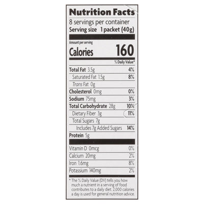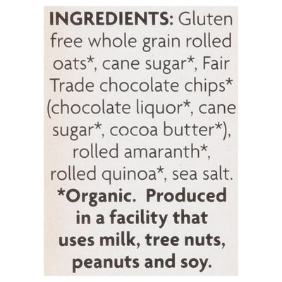 DESCRIPTION: USDA Organic. 100% whole grain or more per serving. wholegrainscouncil.org. Certified Organic: Quality Assurance International. Certified Organic by QAI. Good source of fiber. Non-GMO Project verified. nongmoproject.org. New. Our Organic Promise: The Certified Organic seal on this package guarantees these ingredients have been grown in harmony with nature, reducing exposure to toxic synthetic chemicals and genetically modified seeds. It's been a promise from our family to yours for over 30 years. Our Gluten Free Promise: It's not always easy to find a quick and tasty, gluten free breakfast that also satisfies your sweet tooth. That's why we combined Fair Trade chocolate chips and gluten free rolled oats together to bring you a delicious breakfast treat to help get your mornings started. These quick cook oats are wrapped in single-serve packets for an easy, on-the-go meal that can be enjoyed hot or cold (see our overnight oats recipe!). An Organic Legacy: Our always organic promise goes back to the family farm I was raised on - well before the organic industry began. In 1985, my wife Ratana and I founded Nature's Path Organic Foods based on my dad's advice to Always leave the soil better than you found it, by farming without chemical pesticides, fertilizers or GMOs. For over 30 years, our family has aspired to make delicious organic foods and an enduring independent company that you can love and trust. From our family to yours, Arran Stephens, Co-Founder. Mountain Valley Farm, 1944. I've come to understand that if you want to learn something badly enough, you'll find a way to make it happen. Having the will to search and succeed is very important. Quality guarantee. how2recycle.info. www.naturespath.com. Let's stay connected! Facebook Instagram Tiktok Twitter Pinterest. Consumer Services c/o Nature's Path Foods, #275-250 H St., Blaine WA, 98230 USA or contact us at: www.naturespath.com/contact-us and we'll make things right. Product of USA. < Gluten Free Whole Grain Rolled Oats (Organic), Cane Sugar (Organic), Fair Trade Chocolate Chips (Organic) (Chocolate Liquor (Organic), Cane Sugar (Organic), Cocoa Butter (Organic), Rolled Amaranth (Organic), Rolled Quinoa (Organic), Sea Salt.