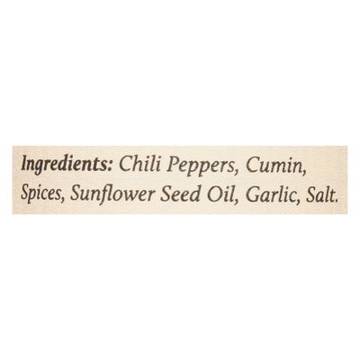 INGREDIENTS: Chili Peppers, Cumin, Spices, Sunflower Seed Oil, Garlic, Salt.