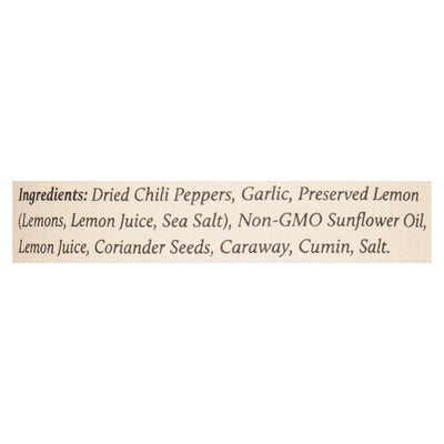 INGREDIENTS: Dried Chili Peppers, Garlic, Preserved Lemon (Lemons, Lemon Juice, Sea Salt), Non-GMO Sunflower Oil, Lemon Juice, Coriander Seeds, Caraway, Cumin, Salt.