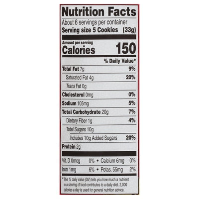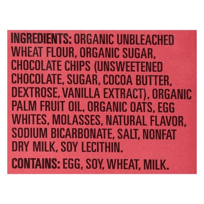 INGREDIENTS: Organic Unbleached Wheat Flour, Organic Sugar, Chocolate Chips (Unsweetened Chocolate, Sugar, Cocoa Butter, Dextrose, Vanilla Extract), Organic Palm Fruit Oil, Organic Oats, Egg Whites, Molasses, Natural Flavor, Sodium Bicarbonate, Salt, Nonfat Dry Milk, Soy Lecithin.
