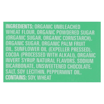 INGREDIENTS: Organic Unbleached Wheat Flour, Organic Powdered Sugar (Organic Sugar, Organic Cornstarch), Organic Sugar, Organic Palm Fruit Oil, Sunflower Oil (Expeller Pressed), Cocoa (Processed with Alkali), Organic Invert Syrup, Natural Flavors, Sodium Bicarbonate, Unsweetened Chocolate, Salt, Soy Lecithin, Peppermint Oil.