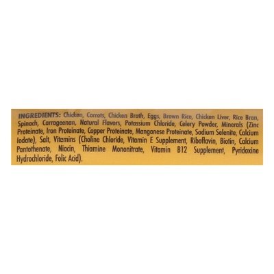 INGREDIENTS: Chicken, Carrots, Chicken Broth, Eggs, Brown Rice, Chicken Liver, Rice Bran, Spinach, Carrageenan, Natural Flavors, Potassium Chloride, Celery Powder, Minerals (Zinc Proteinate, Iron Proteinate, Copper Proteinate, Manganese Proteinate, Sodium Selenite, Calcium Iodate), Salt, Vitamins (Choline Chloride, Vitamin E Supplement, Riboflavin, Biotin, Calcium Pantothenate, Niacin, Thiamine Mononitrate, Vitamin B12 Supplement, Pyridoxine Hydrochloride, Folic Acid).