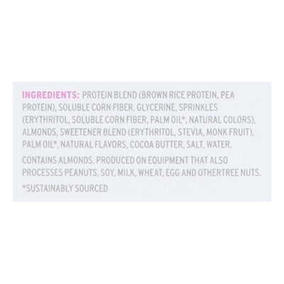 INGREDIENTS: Protein Blend (Brown Rice Protein, Pea Protein), Soluble Corn Fiber, Glycerin, Sprinkles (Erythritol, Soluble Corn Fiber, Palm Oil (Sustainably Source), Natural Colors), Almonds, Sweetener Blend (Erythritol, Stevia, Monk Fruit), Palm Oil (Sustainably Source), Natural Flavors, Cocoa Butter, Salt, Water, Peanuts.