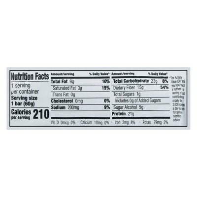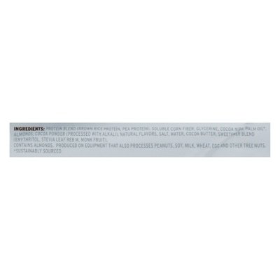 INGREDIENTS: Protein Blend (Brown Rice Protein, Pea Protein), Soluble Corn Fiber, Glycerine, Cocoa Nibs, Palm Oil (Sustainably Sourced), Almonds, Cocoa Powder (Processed with Alkali), Natural Flavors, Salt, Water, Cocoa Butter, Sweetener Blend (Erythritol, Stevia Leaf Reb M, Monk Fruit).