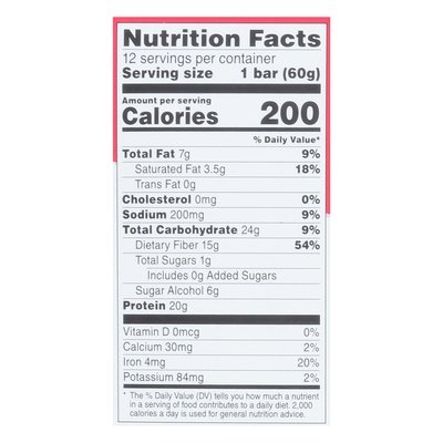 PRODUCT DETAILS: Naturally flavored protein bar. 20 g plant protein. 1 g sugar. 3 g net carbs (24 g carbs - 15 g fiber - 6 g sugar alcohol = 3 g net carbs). Dairy free. Certified gluten free. gfco.org. Gluten free. Vegan. Soy free. Keto friendly. Non-GMO Project verified. nongmoproject.org. nocow.com. Win free stuff! Scan here. Follow the revolution (at)nocow.