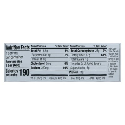 PRODUCT DETAILS: Naturally flavored protein bar. 20 g plant protein. 1 g sugar. 3 g net carbs (26 g carbs - 16 g fiber - 7 g sugar alcohol = 3 g net carbs). Dairy free. Gluten free. Vegan. Soy free. Certified gluten free. gfco.org. Keto friendly. Non GMO. Non-GMO Project verified. nongmoproject.org. It's really not rocket science. I just created a dairy free protein bar that's ridiculously low in sugar and high in protein because there's nothing else like it. - D Katsz, Founder. nocow.com. Feeling lucky? Scan. Follow the revolution (at)nocow. Recycle me.