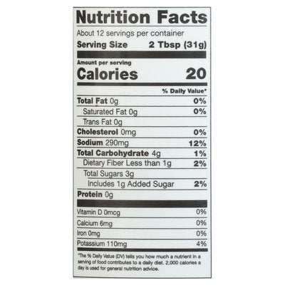 INGREDIENTS: Tomato Puree (Water, Tomato Paste), Apple Cider Vinegar, Apple Juice Concentrate, Salt, Paprika, Onion Powder, Chili Powder, Black Pepper, Natural Mesquite Smoke Flavor, Garlic Powder, Tamarind Concentrate, Cayenne Pepper, Allspice, Cloves.