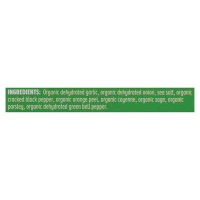 INGREDIENTS: Organic Dehydrated Garlic, Organic Dehydrated Onion, Sea Salt, Organic Cracked Black Pepper, Organic Orange Peel, Organic Cayenne, Organic Sage, Organic Parsley, Organic Dehydrated Green Bell Pepper.