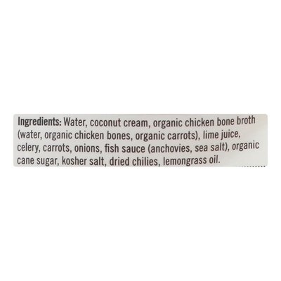 INGREDIENTS: Water, Coconut Cream, Organic Chicken Bone Broth (Water, Organic Chicken Bones, Organic Carrots), Lime Juice, Celery, Carrots, Onions, Fish Sauce (Anchovies, Sea Salt), Organic Cane Sugar, Kosher, Salt, Dried Chilies, Lemongrass Oil.