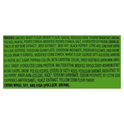 INGREDIENTS: Enriched Wheat Flour (Wheat Flour, Niacin, Reduced Iron, Thiamine Mononitrate, Riboflavin, Folic Acid), Palm Oil, Potato Starch, Modified Potato Starch, Salt, Contains Less than 2% of: Anchovy Extract (Powdered), Artificial Flavors, Beef Bone Extract (Powdered), Beef Extract (Powdered), Beef Fat (Powdered), Black Pepper (Powdered), Cellulose (Powdered), Citric Acid, Corn Starch, Corn Syrup, Defatted Soy Flour, Dextrose, Disodium Guanylate, Disodium Inosinate, Disodium Succinate, Dried Kimchi Flakes (Napa Cabbage, Salt, Red Chili Pepper, Garlic, Ginger), Dried Vegetables (Carrot, Green Onion), Fermented Wheat Protein, Garlic (Powdered), Gum Arabic, Hydrolyzed Soy Protein, Leek Extract (Powdered), Malic Acid, Maltodextrin, Modified Tapioca Starch, Mushroom Extract (Powdered), Napa Cabbage Extract (Powdered), Natural Flavors, Non-Dairy Lactic Acid, Onion (Powdered), Potassium Carbonate, Radish Extract (Powdered), Red Chili Pepper (Powdered), Red Jalapeno (Powdered), Riboflavin (Color), Rice Flour, Sodium Carbonate, Sodium Phosphates, Sugar, Tocopherols (Antioxidant), Yeast Extract, Yellow Corn Flour.