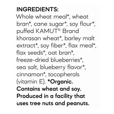 INGREDIENTS: Whole Wheat Meal (Organic), Wheat Bran (Organic), Cane Sugar (Organic), Soy Flour (Organic), Puffed Kamut Khorasan Wheat (Organic), Barley Malt Extract (Organic), Soy Fiber (Organic), Flax Meal (Organic), Flax Seeds (Organic), Oat Bran (Organic), Freeze-Dried Blueberries (Organic), Sea Salt, Blueberry Flavor (Organic), Cinnamon (Organic), Tocopherols (Vitamin E).