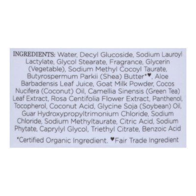 INGREDIENTS: Water, Decyl Glucoside, Sodium Lauroyl Lactylate, Glycol Stearate, Fragrance Glycerin (Vegetable), Sodium Methyl Cocoyl Taurate, Butyrospermum Parkii (Shea) Butter (Certified Organic Ingredients) (Fair Trade Ingredient), Aloe Barbadensis Leaf Juice, Goat Milk Powder, Cocos Nucifera (Coconut) Oil, Camellia Sinensis (Green Tea) Leaf Extract, Rosa Centifolia Flower Extract, Panthenol, Tocopherol, Coconut Acid, Glycine Soja (Soybean) Oil, Guar Hydroxypropyltrimonium Chloride, Sodium Chloride, Sodium Methyltaurate, Citric Acid, Sodium Phytate, Caprylyl Glycol, Triethyl Citrate, Benzoic Acid.