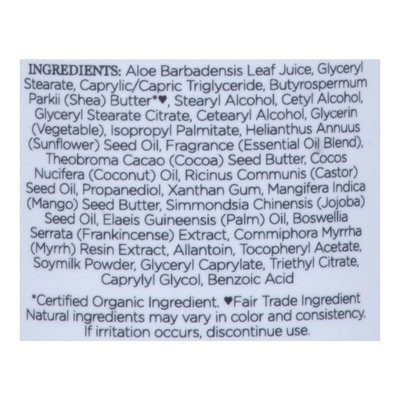INGREDIENTS: Aloe Barbadensis Leaf Juice, Glyceryl Stearate, Caprylic/Capric Triglyceride, Butyrospermum Parkii (Shea) Butter (Certified Organic Ingredient) (Fair Trade Ingredient), Stearyl Alcohol, Cetyl Alcohol, Glyceryl Stearate Citrate, Cetearyl Alcohol, Glycerin (Vegetable), Isopropyl Palmitate, Helianthus Annuus (Sunflower) Seed Oil, Fragrance (Essential Oil Blend), Theobroma Cacao (Cocoa) Seed Butter, Cocos Nucifera (Coconut) Oil, Ricinus Communis (Castor) Seed Oil, Propanediol, Xanthan Gum, Mangifera Indica (Mango) Seed Butter, Simmondsia Chinensis (Jojoba) Seed Oil, Elaeis Guineensis (Palm) Oil, Boswellia Serrata (Frankincense) Extract, Commiphora Myrrha (Myrrh) Resin Extract, Allantoin, Tocopheryl Acetate, Soymilk Powder, Glyceryl Caprylate, Triethyl Citrate, Caprylyl Glycol, Benzoic Acid.