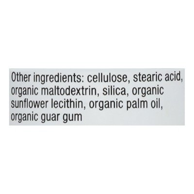 INGREDIENTS: Other Ingredients: Cellulose, Stearic Acid, Organic Maltodextrin, Silica, Organic Sunflower Lecithin, Organic Palm Oil, Organic Guar Gum.