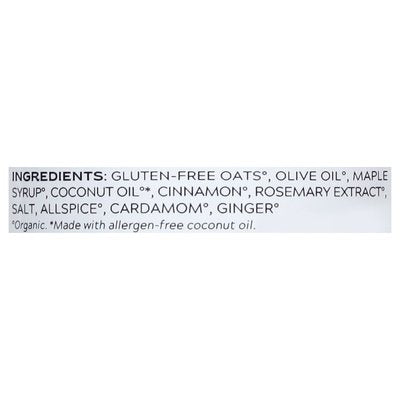 INGREDIENTS: Gluten-Free Oats (Organic), Flax (Organic), Olive Oil (Organic), Maple Syrup (Organic), Coconut Oil (Organic) (Made with Allergen-Free Coconut Oil), Cinnamon (Organic), Salt, Allspice (Organic), Cardamom (Organic) Ginger (Organic), Rosemary Extract (Organic).