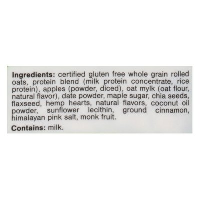 INGREDIENTS: Certified Gluten Free Whole Grain Rolled Oats, Protein Blend (Milk Protein Concentrate, Rice Protein), Apples (Powder, Diced), Oat Mylk (Oat Flour, Natural Flavor), Date Powder, Maple Sugar, Chia Seeds, Flaxseed, Hemp Hearts, Natural Flavors, Coconut Oil Powder, Sunflower Lecithin, Ground Cinnamon, Himalayan Pink Salt, Monk Fruit.